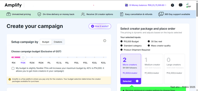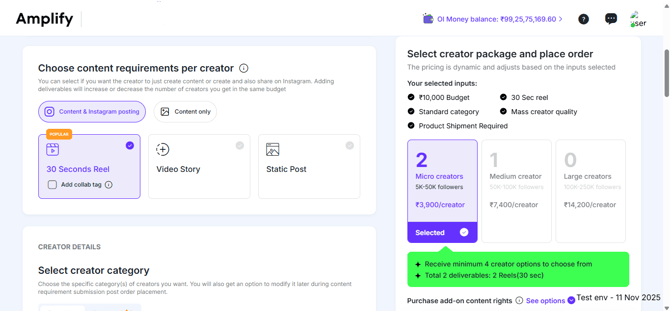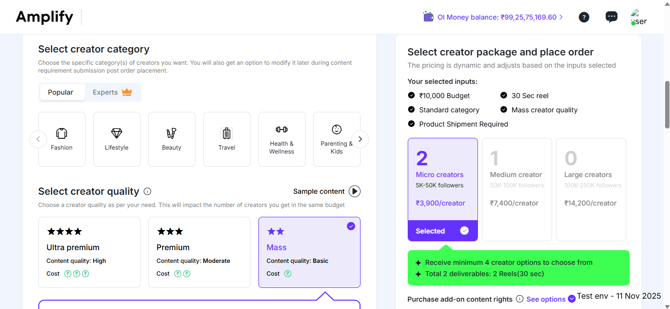 The creator category ensures your campaign reaches the right audience by matching influencers whose content aligns with your brand or product niche. The creator quality affects the influencers’ reach and engagement and content quality—higher-quality creators offer better results but are fewer in number within the same budget.